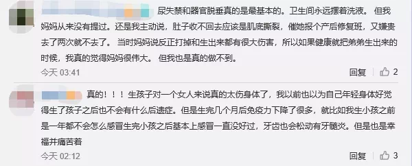 當公眾人物也參與進來討論時,「生育后遺癥」這個話題瞬間成為爆點,一下子炸出了好多評論留言。開啟這個話題的網友JZ就是生過兩個小孩的媽媽,她說:“以前讀新聞,看到媽媽帶著孩子一起自殺的案例總覺得媽媽太自私,聽好幾個媽媽講自己的產后抑郁癥后,當看到那么具體的對肉體及精神的痛的表達,終于可以理解到她們的絕望。”她表示,一個女性不論是否想成為一個母親,都需要對生育有知情權。這些「屎尿屁」都不應是羞于啟齒的。
