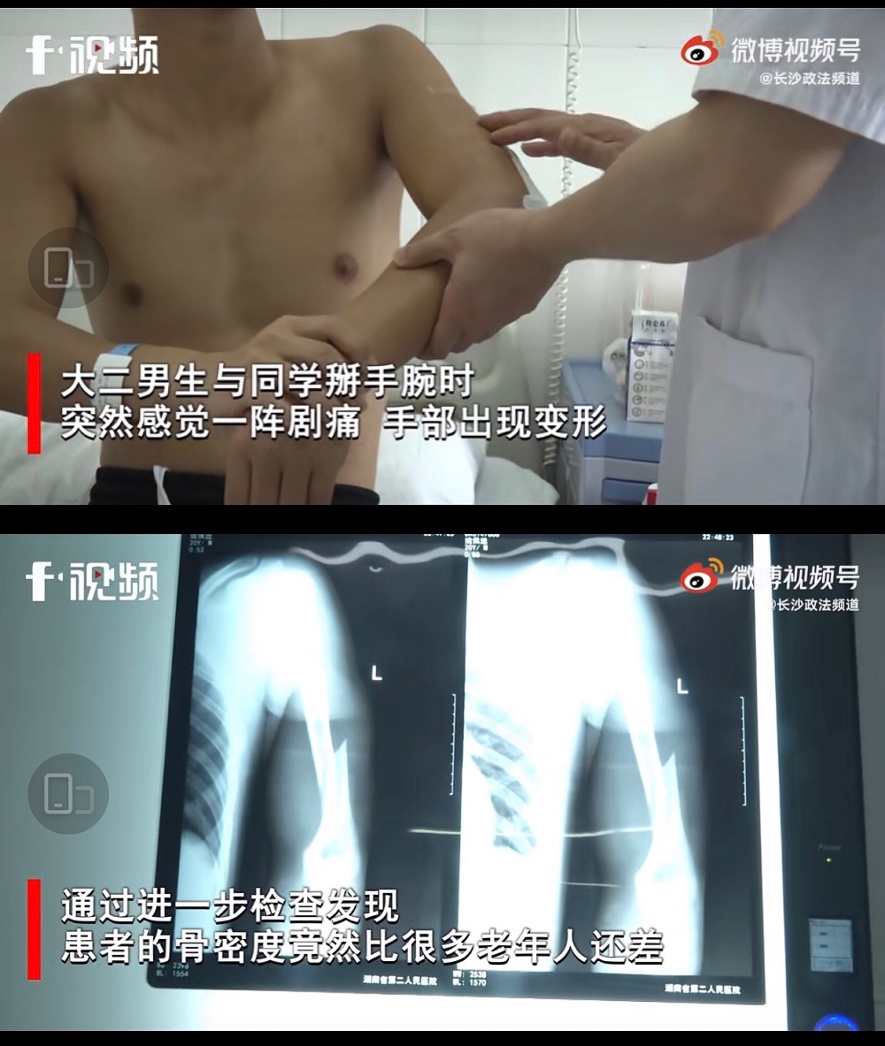 近日新聞報(bào)道,湖南長(zhǎng)沙一名大二學(xué)生跟同學(xué)玩掰手腕時(shí),突然覺得一劇疼痛,手部還出現(xiàn)變形,緊急送醫(yī)后被診斷為粉碎性骨折。醫(yī)生發(fā)現(xiàn),這個(gè)大學(xué)生的骨密度竟然比很多老年人還低。