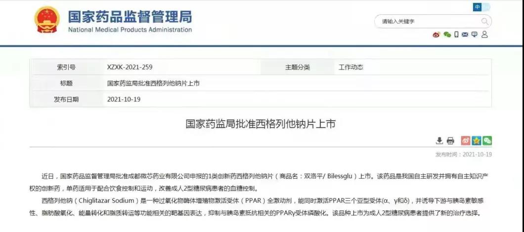 據NMPA官網介紹,作為一種新PPAR全激動劑,西格列他鈉在2型糖尿病治療中,不但可以控制血糖,還可以治療患者通常伴發的脂代謝及能量代謝紊亂,進而有益于心血管并發癥的預防和控制,有望成為一個新型且更為綜合的2型糖尿病藥物治療手段。